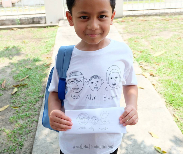 He's wearing his own design! Teehee! Ini hasil corat coret hari itu. Hasil kangen sama Ayah. Akhirnya gambar yg ini diabadikan jadi kaos 😊